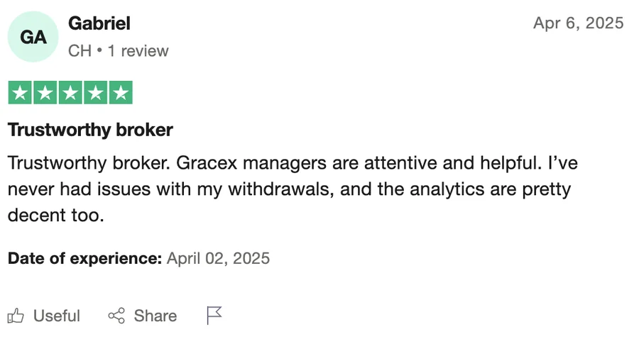 Gracex has earned notable recognition: “The Fastest Growing Broker 2024” by the World Financial Award and “The Best Customer Support 2024” by the Forex Brokers Association. These accolades signal strong performance and client-oriented practices, suggesting the broker is committed to quality service. Such awards also appear consistently in trader reviews, reinforcing its reputation among beginners and pros alike.